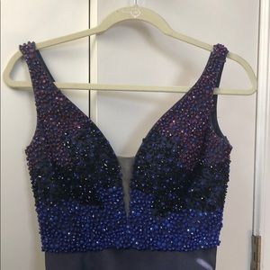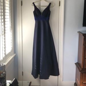 2017 prom dress!! I bought this navy blue gown with pockets and a unique beaded top from a pageant boutique. Size 4, however I am a size 2 normally and it fits me.