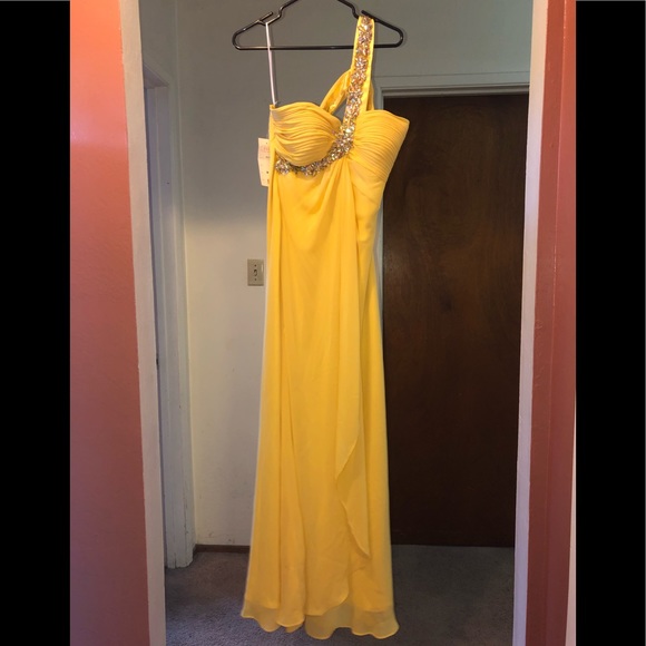 Yellow, floor length, one shoulder prom dress by Eva Comes with matching shawl