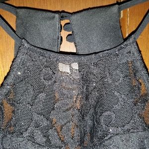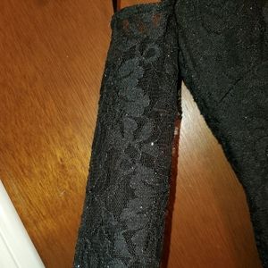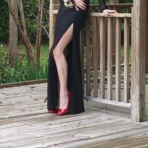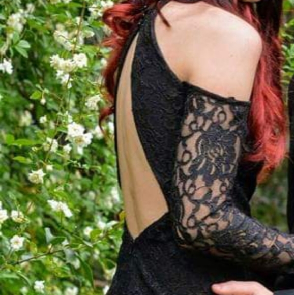 Black, open back and shoulders, slit in the leg, top part of neck and the arms are see through.