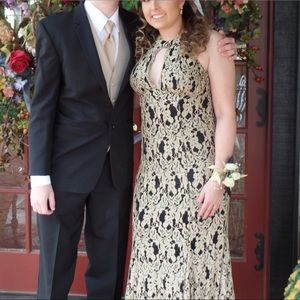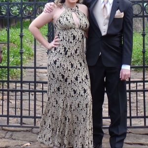 Black with gold lace prom dress. Size 7/8. Worn once. Loose mermaid style