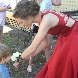 Beautiful red prom dress, it has pockets and a strappy back. It’s a size 3 but it fits like a 1 or 2