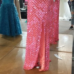 Pink sparkly mesh neck, right mid leg slit, eyelet back, bedazzled bodest, short sleeved.