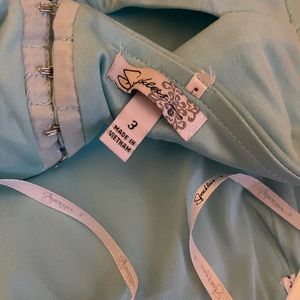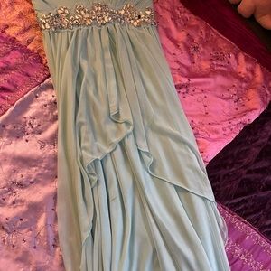 A-line, strapless, floor length, chiffon prom dress with beading along the empire waistline. Size 3 aquamarine, worn once, one very tiny spot on the front