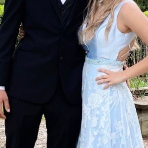 Prom dress size small, worn once, has been altered at bottom for shorter length, color light blue