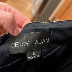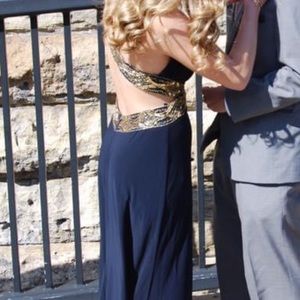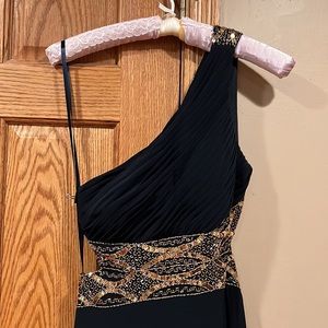 NAVY dress with gold sequins. Very dark navy so it looks black in the pictures. One shoulder, very open back. Thick material, not see through, zipper and clasp intact. Worn once!