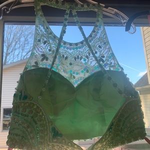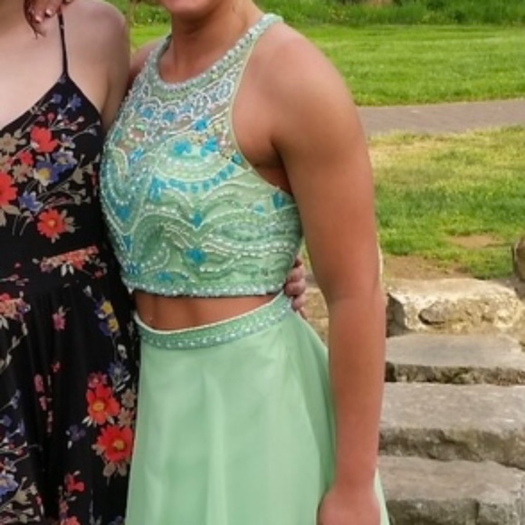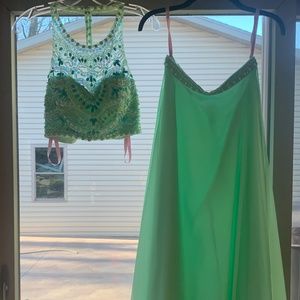 Honeydew color beaded dress. 2 piece crop. Hemmed for 5’1 girl. Good condition
