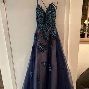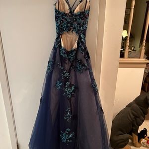 Only wore one time for three hours, originally $500 dress bought at Raelynn’s boutique in Carmel Indiana. Absolutely gorgeous dress no stains no rips excellent condition.