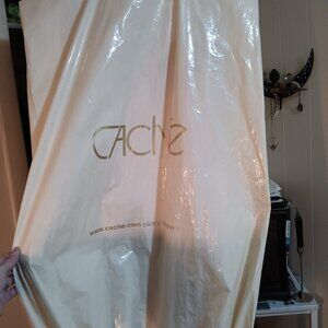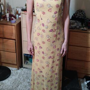Silk lined prom dress, yellow with floral pattern and beading. Slit in the back. Only worn once for an hour and a half to my prom back in 2002. Has been hanging in closet in original bag since then. No defects or flaws. Size is XS.