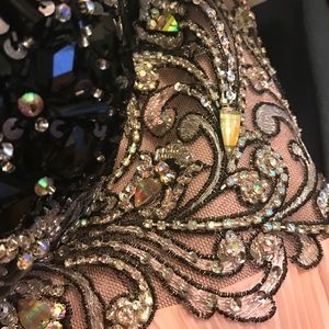 My favorite and worn once! Most beautiful detailing. Black beading detailing with light pink chiffon bottom. The very bottom is torn (shown) but could be hemmed for someone shorter or made into a short dress period. Price negotiable.