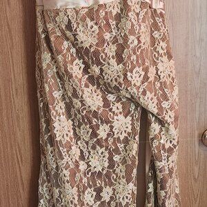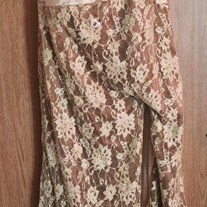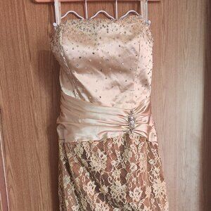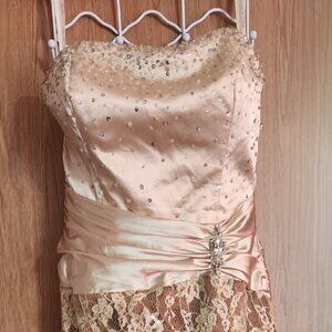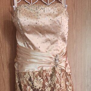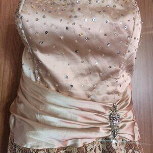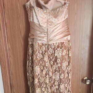 Satiny, silky, cream ruched bodice with beading and sequins. Gown has a knee length slit. Worn once and stored in pet free smoke free home. Some minor flaws are a few sequins are missing on front of dress, minor wear and tear on bottom of gown. Also zipper functions perfectly but latch hook would be an optional fix for wear. Minor stain on inside which will not show during wear. The dress is in very good shape and could easily be worn as is but I am giving a honest review of product. I have also pictured all minor flaws.