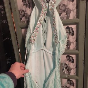 Mint colored, in season dress. Worn for a few hours. Very sparkly with lace. Size 0 but fits size 2. I am asking $130