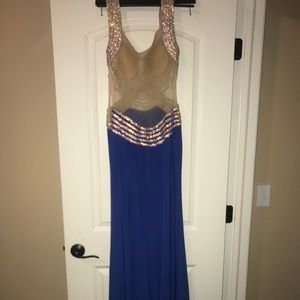 Royal blue with open back and gold rhinestones on shoulders. I am 5'5!
