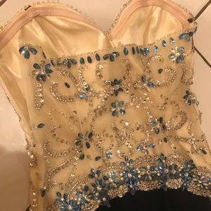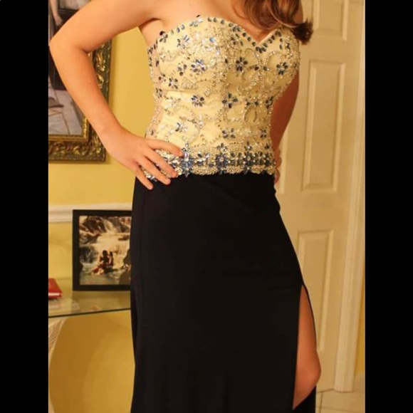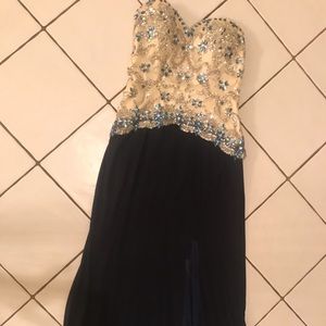 Navy and cream strapless with a sweetheart neckline full length dress. Prom dress with swarovski crystals. Thigh high slit. Size 6 tailored into the waist. Fits more like a 4. Best for height of 5’2 to 5’5 for length to fit properly. Built in cups...AVAILABLE willing to Negotiate