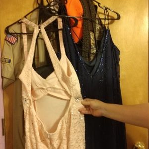 Two prom dresses one. Navy blue one is size 22 the peach/pink is a size 15