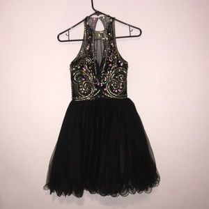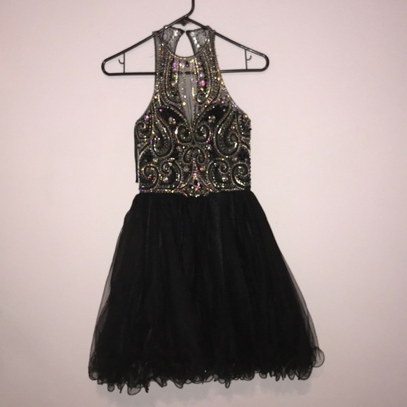 Cute rhinestone short black prom dress. Some tool was taken out so it’s not as poofy. Partially open back with mesh in the front and some on the back. surprisingly not itchy at all.