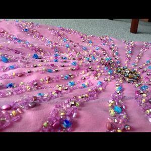 Gorgeous, elegant yet sexy dress! Worn once to my Sr. Prom in 2010. This dress is hand beaded from top to bottom. It's a halter top and as you can see in the cover picture it is completely open back and low cut in the front. Although it is a size 12 it fit me just fine and I am a size 6 dress size, so I'm sure if you're any size between it'll fit fine. It comes with padded boobs and a lil bag of extra beads to add. Unfortunately as you can see in the 4th picture there are some loose threads.
