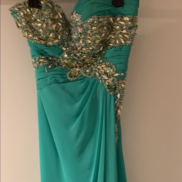 Gorgeous pale-green/ turquoise formal strapless dress with rhinestone bodice is classy and elegant. Don’t miss out!