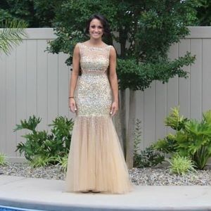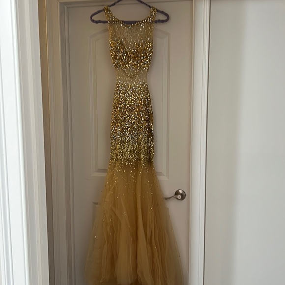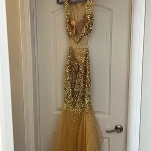 Beautiful sequence fit and flare style gold/tan gown. Open low back with strap across upper back