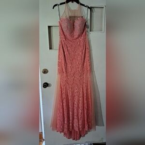 peach halter prom gown peach with rhinestones. smoke free home. very pretty. fits more like a size 8