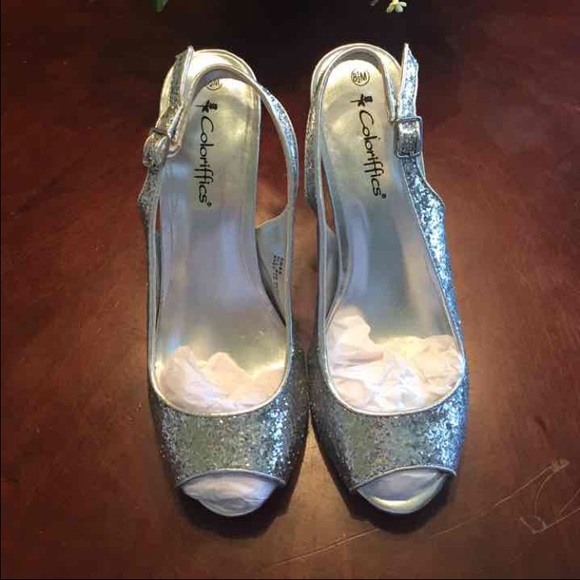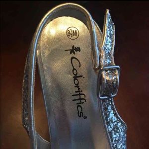 Silver, glitter, 4", open toed, single strap, size 8.5 heels! Worn once for 3 hours! Non-smoking environment! Glitter does not fall off! Very comfortable and easy to walk in! Originally paid $75 but asking $45!