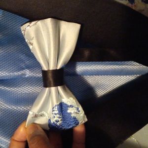 This prom blazer has only been worn once by my son. The blazer brand is Eleganza Black by Giorgio Sanetti . The button on the blazer is slightly loose but is an easy fix. Also the blazer comes with a matching bow tie. The size of the blazer is 44R and a modern fit.