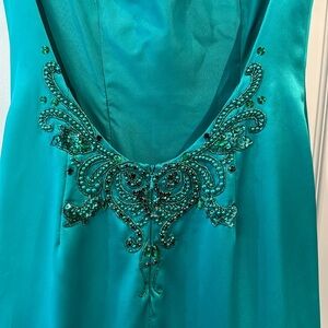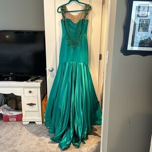 Absolutely stunning emerald green prom or pageant dress. Mermaid swooping back. Little to no damage. Worn once. Taken in to a size 6.