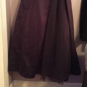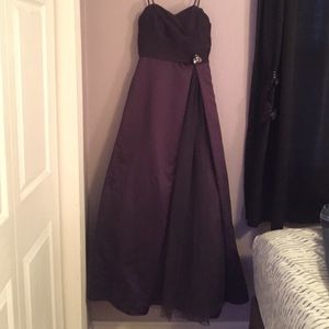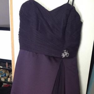 This is a plum purple dress. This is a prom/ball-gown style dress. I actually wore this for a wedding I was in. I got the dress at David's Bridal. It was a size 4, fitted to a size 2/3. The jewels that is on the left side, is actually a pin that can easily be removed. The dress is actually light in weight for having a few laters underneath for the poof. This is a good dress for a Semi Formal, prom, etc.