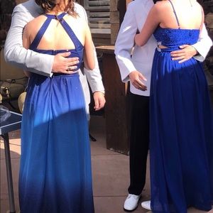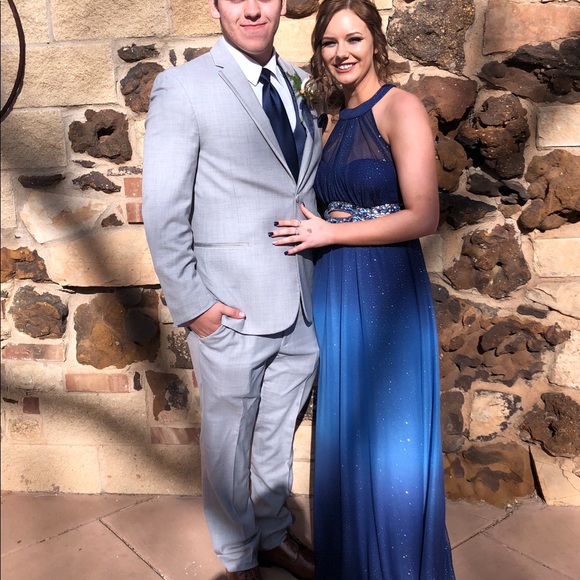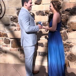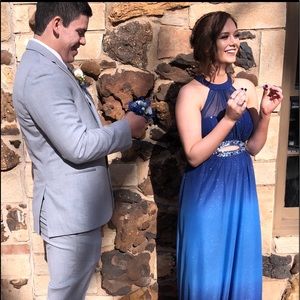 Beautiful blue color prom dress used one evening no tear’s rips nor stains in perfect condition sent to the dry cleaners so it is professionally cleaned and ready to wear any questions please ask