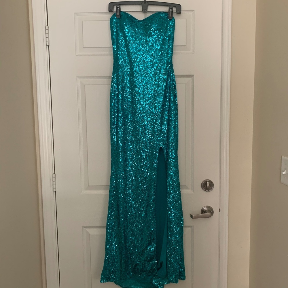 Floor length, left thigh slit, sequined, Strapless.