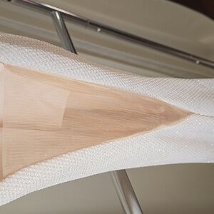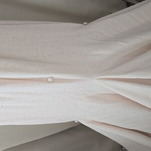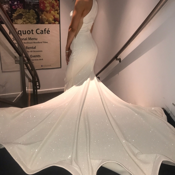 Gorgeous Jovani dress. Worn once. Back zip, with neck clasps, side open mesh, with tie up buttons for the train in the back. Has been dry cleaned. L(front): approx. 55"