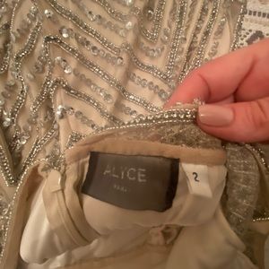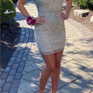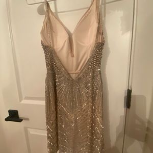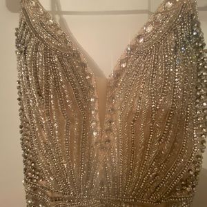 Stunning. Champagne/Silver color. Entire dress is beaded. All heading in tact. Only worn once. Paid $700