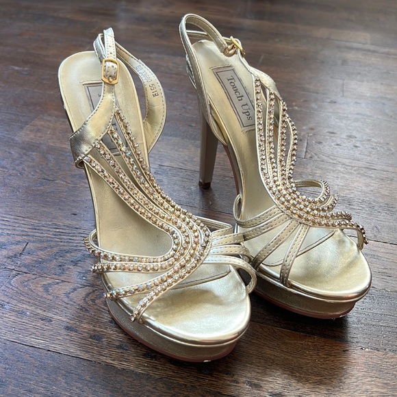Gold prom/ formal heels. Worn once to Prom. Size 8. Minimal scuffs. Gold with bedazzles.