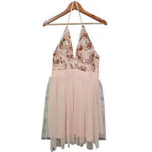 PromGirl Halter Sequin Homecoming Mini Dress Rose Gold Size L NWT
