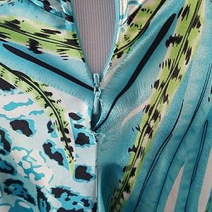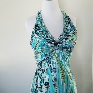 Full length dress. V-neck & open back. Lined & built in bra. Minor tailoring required (see photo). A little worn on bottom of skirt (only unnoticeable up close). Needs to be dry cleaned (see photo).