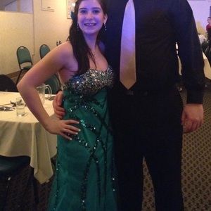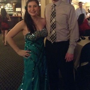 Beautiful long evening gown, features a fully stoned Top with sequins down the length of the dress, mermaid style! This dress is a size six but was altered to a size 2-4 worn once for winter ball and in absolute perfect condition!