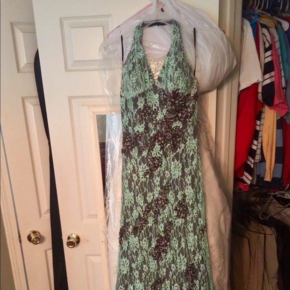 Like New Prom Dress - turquoise and brown - halter style - full body length - brown under lay with turquoise lace and sequins - size 8