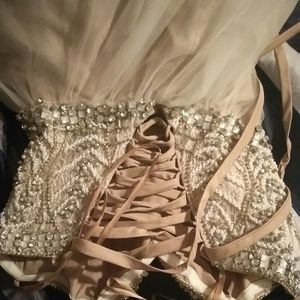 Custom gown, hand embroidered, size 4 , minor alterations can be taken out to a size 6, gold, ball gown style skirt, corset style top