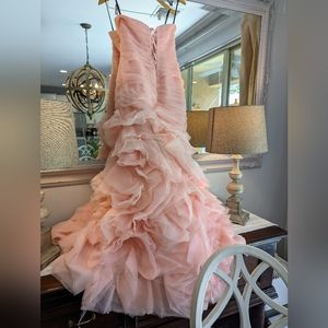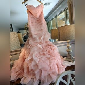 let my lack of closet space be to your gain! I have a beautiful blush-colored, textured, mermaid/trumpet dress. It has a small train, is a label size 6 but because of the corset back can accommodate larger or smaller.