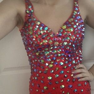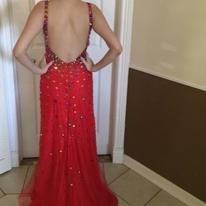 A red fitted dress with blue/gold stones that reflect in the light. It has an open back and a mini train. Model is 5'7 and used 4 inch heels for the front to not touch the floor. Beautiful slit on the left side. Worn once.