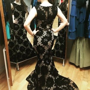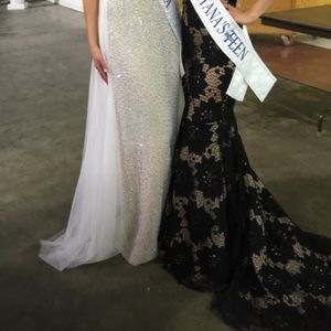 Black and nude lace prom or pageant dress. Worn a few times with some scuff marks on the bottom. Not name brand but bought at a bridal store. I am 5’3” and wore 5” heels. Does have a train!