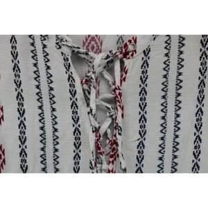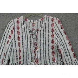 This is a Promesa Aztec Bell Sleeves Tunic that is a size Large in Jrs. It is 100% Rayon. Laying flat, it measures: Armpit to armpit-17.5" and the length is 27". It laces up in the front with tassels on the tie ends. In good condition.