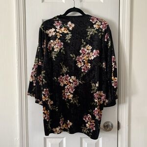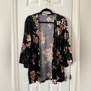 Elegant black cardigan with floral design. Features pink and cream flowers. Perfect for layering.