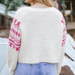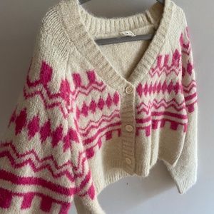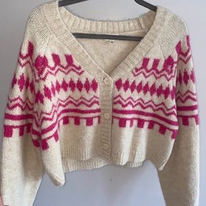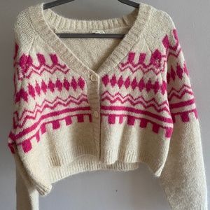 Cute cropped cardigan by Promesa, purchased from Magnolia Boutique. Cream with pink abstract design. Size small, worn once.