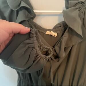 Promesa Green Ruffle Jumpsuit in women’s Size Small. Minimalist. Bubble hem sleeves. Elasticized waist. Jumpsuit is in very good used condition with no flaws or stains and minimal wash wear. Pit to pit measures approx 17 in across, waist at elastic approx 12.5 in across, rise from elastic down approx 12.5 in, length from top of front shoulder to elastic band approx 12 in, inseam approx 26.5 in, length from top of front shoulder to bottom hem approx 51.5 in, and leg opening approx 7 in. Please see close-up pictures for condition details.