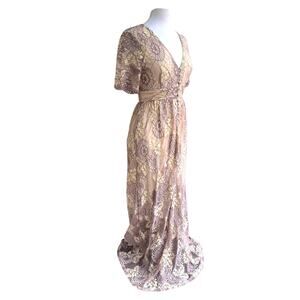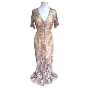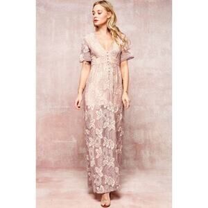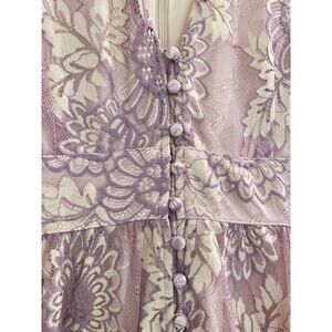 Promesa Lavender Lace Maxi Dress S Feminine Boho Fairy VNeck Sheer Button Detail
