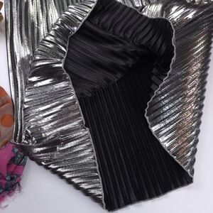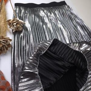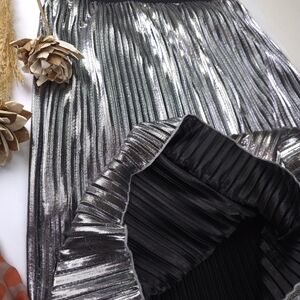 Shine in style with this metallic silver pleated skirt. Perfect for any occasion, this skirt adds a touch of elegance to your wardrobe.