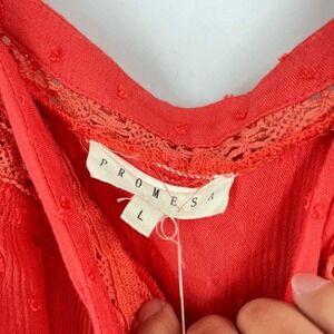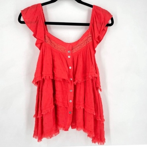 Chic ruffle blouse with button front. Features layered design and lace detail. Perfect for casual outings.
