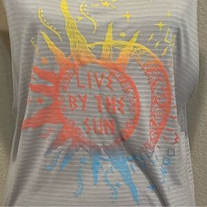 Brand new boutique item, made in the USA. Sheer striped light gray fabric with multicolor graphic reading “live by the sun, love by the moon.” Sun and moon graphic in yellow, orange & blue. Deep cut arm holes & raw hem. Lightweight. Super cute over a bathing suit top. Photos are a part of the description. Color may vary with lighting or device.