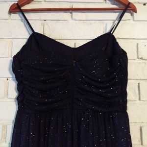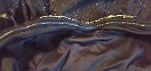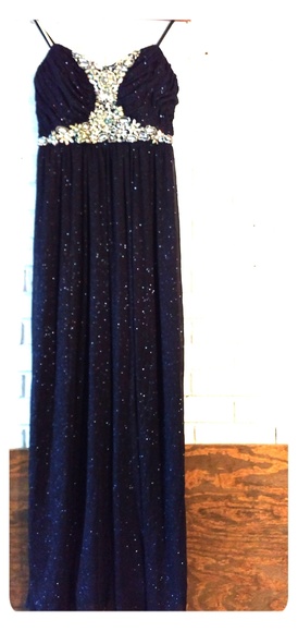 Stunning strapless full length dress, has elastic to keep up on chest! Color is navy blue and sparkling (3rd pic shows actual color) Diamond beading in great shape as well! Purchased new at Dillard's about 7 months ago. Worn one time for a wedding! I'm 5'4 wearing a 4 inch wedge dress just touches the floor. Measuring roughly 51/52 in laying flat from pit to bottom. Can be worn for many occasions 👗