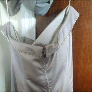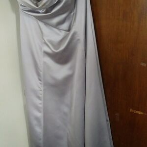 Full floor length silver prom dress. Worn once. Has stains. Price reflects that.